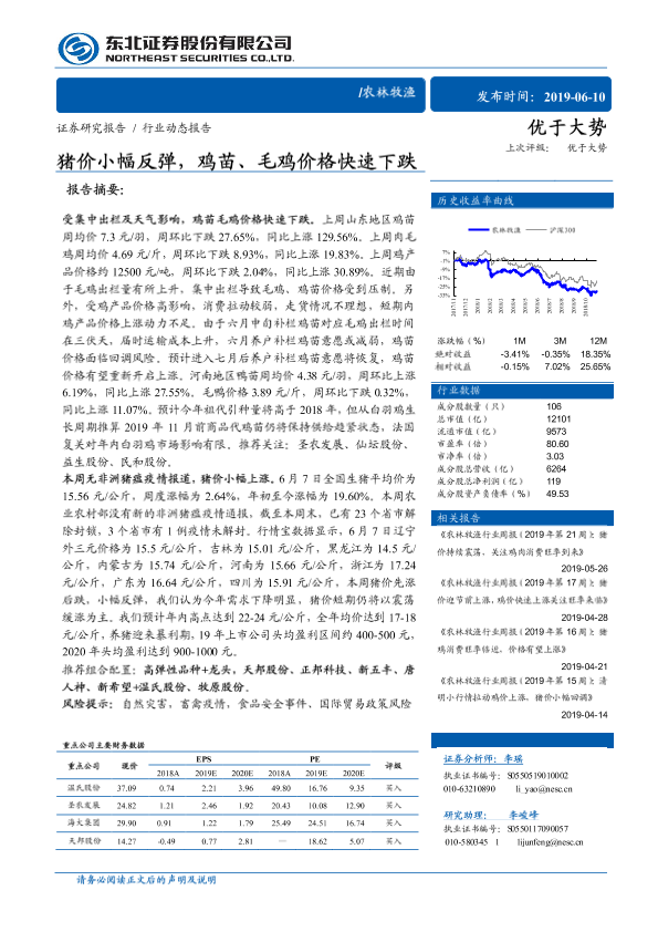 【东北证券】【20190610】20190610-东北证券-农林牧渔行业动态报告:猪价小幅反弹,鸡苗、毛鸡价格快速下跌-11页