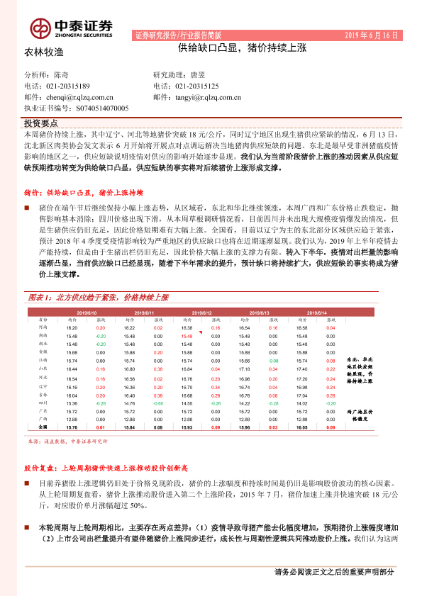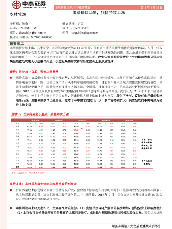 【中泰证券】【20190616】农林牧渔:供给缺口凸显,猪价持续上涨-10页