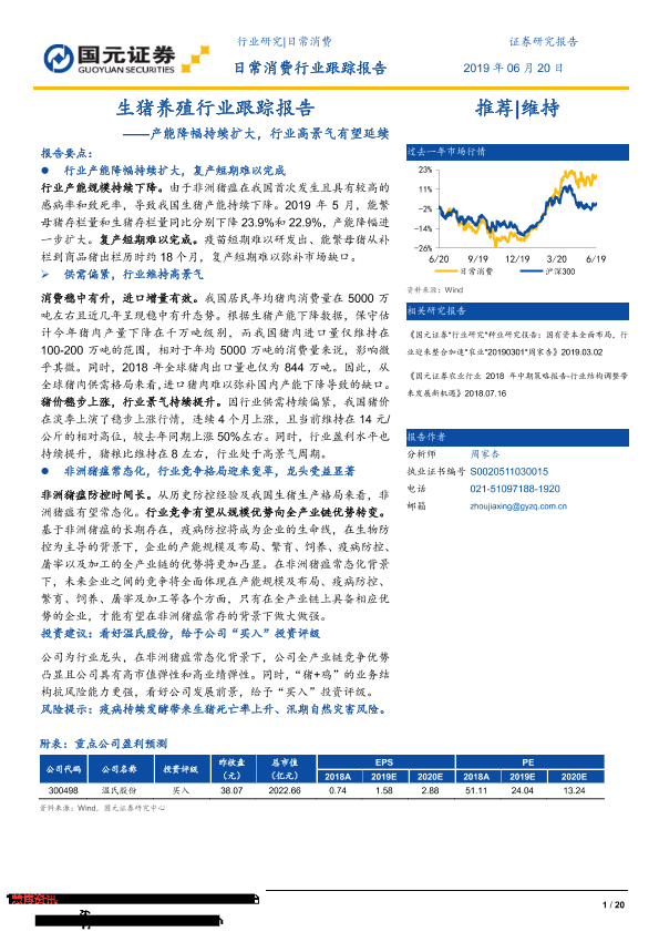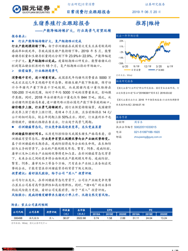 【国元证券】【20190620】生猪养殖行业跟踪报告:产能降幅持续扩大,行业高景气有望延续-20页
