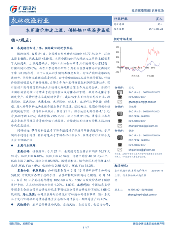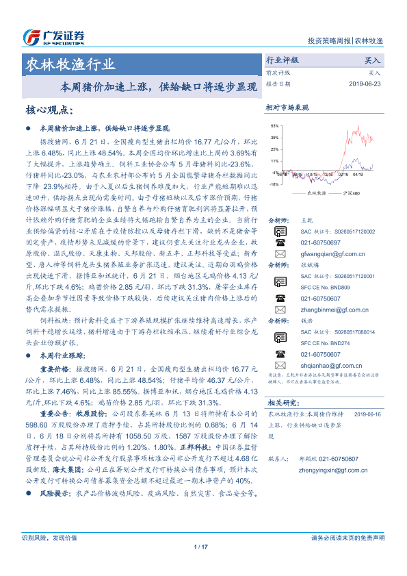 【广发证券】【20190623】20190623-广发证券-农林牧渔行业投资策略周报:本周猪价加速上涨,供给缺口将逐步显现-17页