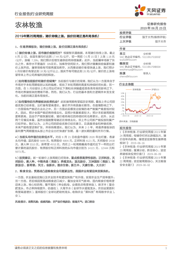 【天风证券】【20190623】2019年第25周周报:猪价持续上涨,股价回调正是布局良机!-14页