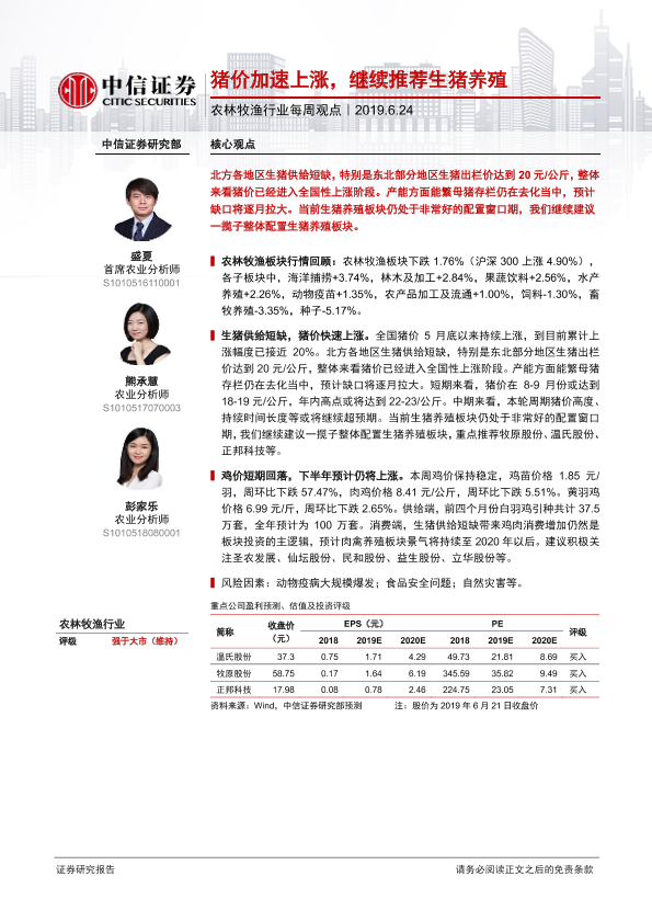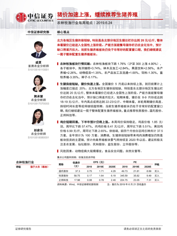 【中信证券】【20190624】20190624-中信证券-农林牧渔行业每周观点:猪价加速上涨,继续推荐生猪养殖-6页