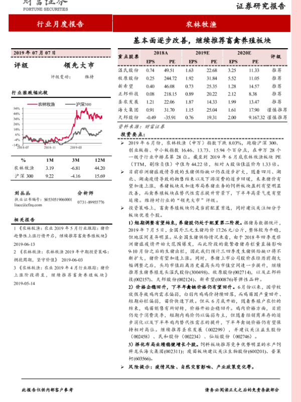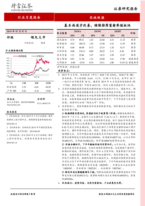 【财信证券】【20190707】20190707-财信证券-农林牧渔行业月度报告:基本面逐步改善,继续推荐畜禽养殖板块-13页