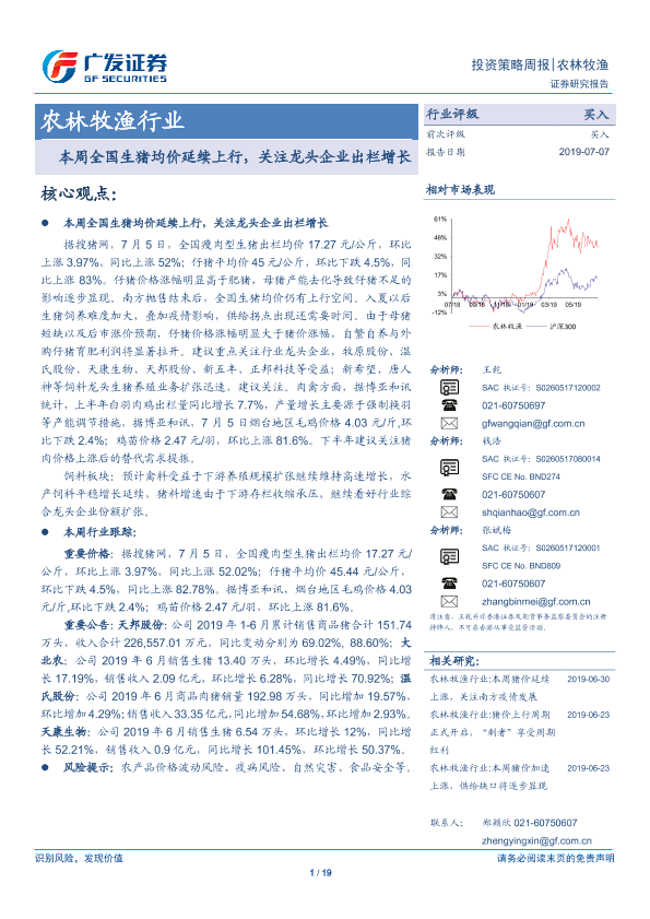 【广发证券】【20190707】20190707-广发证券-农林牧渔行业:本周全国生猪均价延续上行,关注龙头企业出栏增长-19页