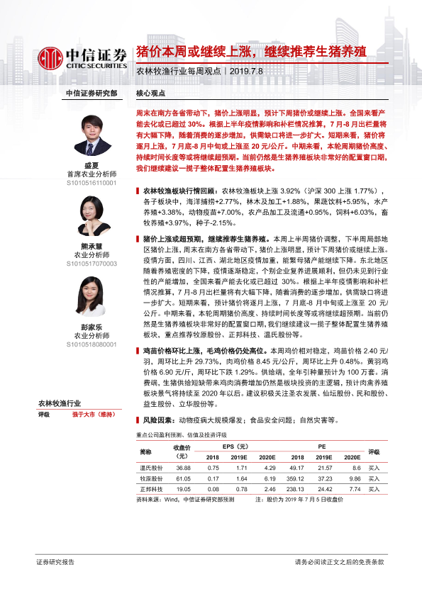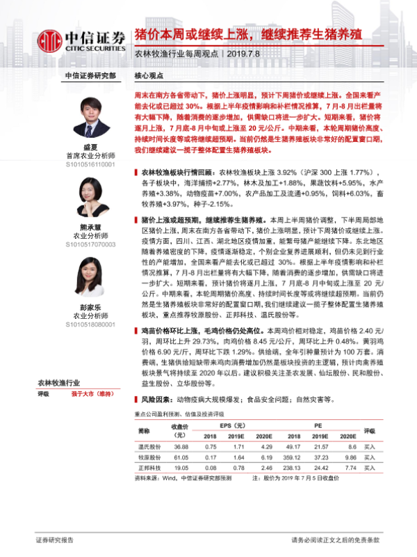 【中信证券】【20190708】20190708-中信证券-农林牧渔行业每周观点:猪价本周或继续上涨,继续推荐生猪养殖-6页