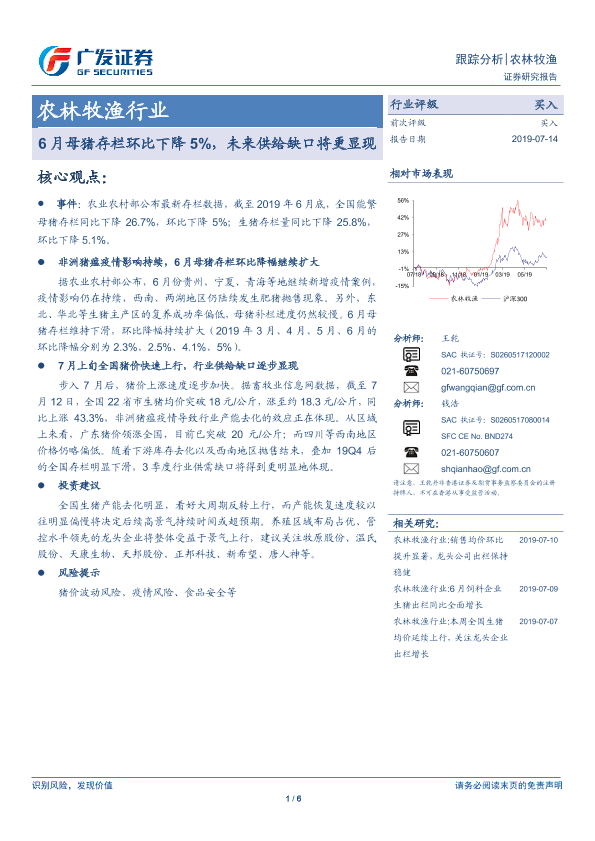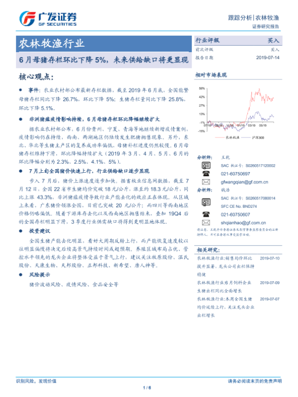 【广发证券】【20190714】农林牧渔行业:6月母猪存栏环比下降5%,未来供给缺口将更显现-6页