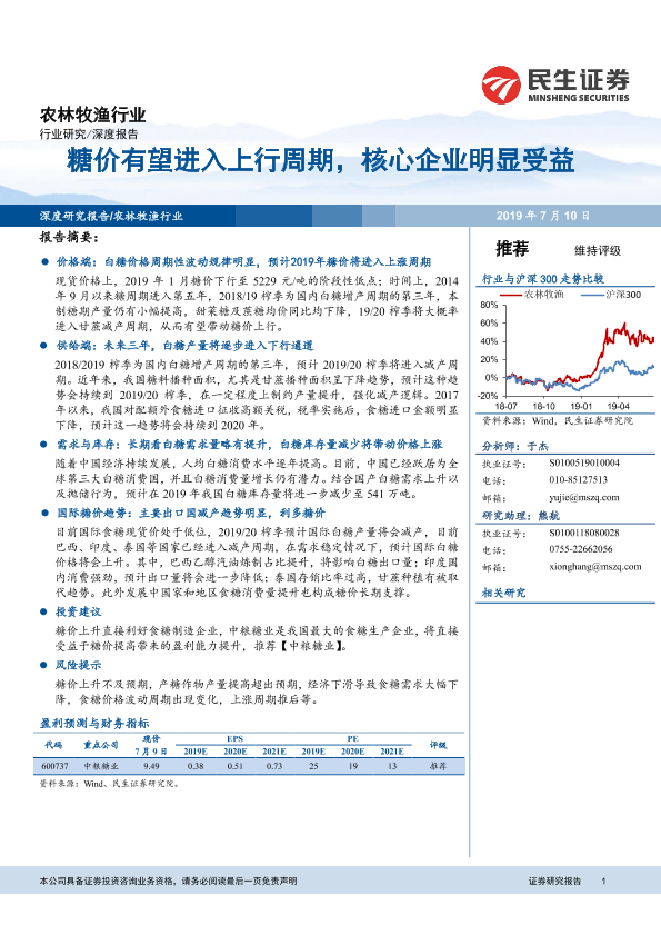 【民生证券】【20190710】农林牧渔行业:糖价有望进入上行周期,核心企业明显受益-15页