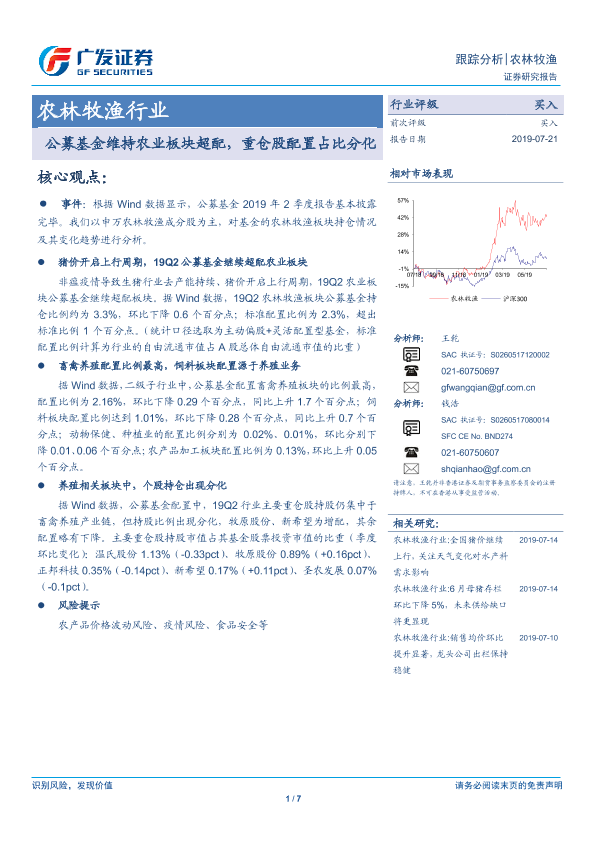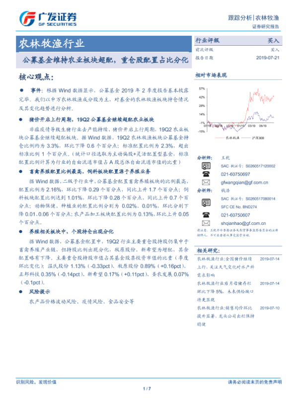 【广发证券】【20190721】农林牧渔行业跟踪分析:公募基金维持农业板块超配,重仓股配置占比分化-7页