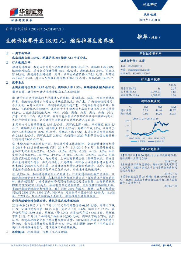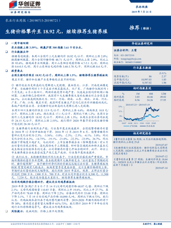 【华创证券】【20190721】20190721-华创证券-农业行业周报:生猪价格攀升至18.92元,继续推荐生猪养殖-26页