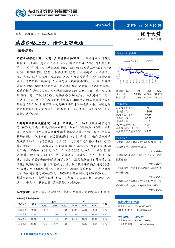 【东北证券】【20190729】20190729-东北证券-农林牧渔行业动态报告:鸡苗价格上涨,猪价上涨放缓-12页