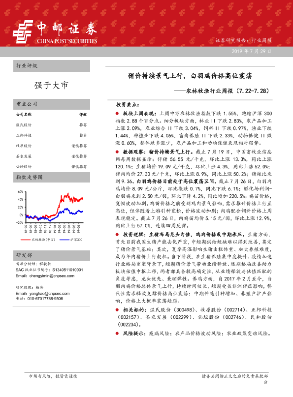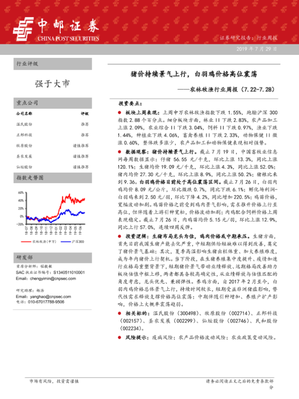 【中邮证券】【20190729】20190729-中邮证券-农林牧渔行业周报:猪价持续景气上行,白羽鸡价格高位震荡-14页