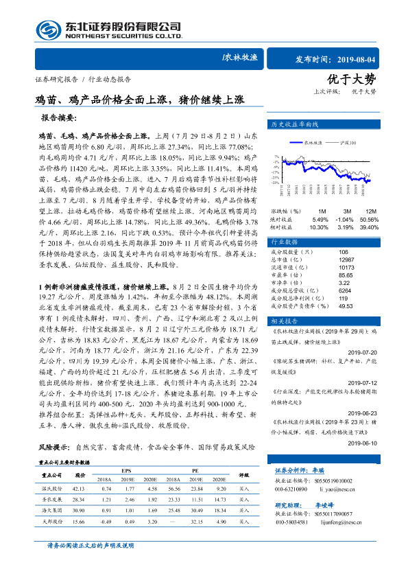 【东北证券】【20190804】20190804-东北证券-农林牧渔行业动态报告:鸡苗、鸡产品价格全面上涨,猪价继续上涨-12页
