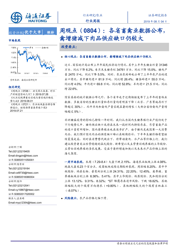 【海通证券】【20190804】20190804-海通证券-农业周观点:各省畜禽业数据公布,禽增猪减下肉品供应缺口仍较大-5页