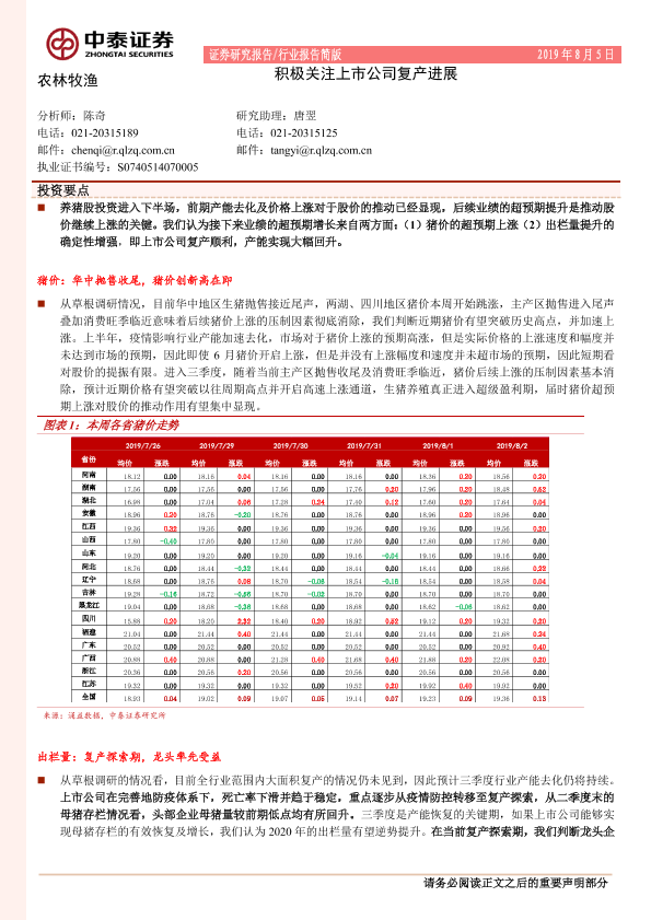 【中泰证券】【20190805】中泰证券-农林牧渔行业报告简版:积极关注上市公司复产进展-11页