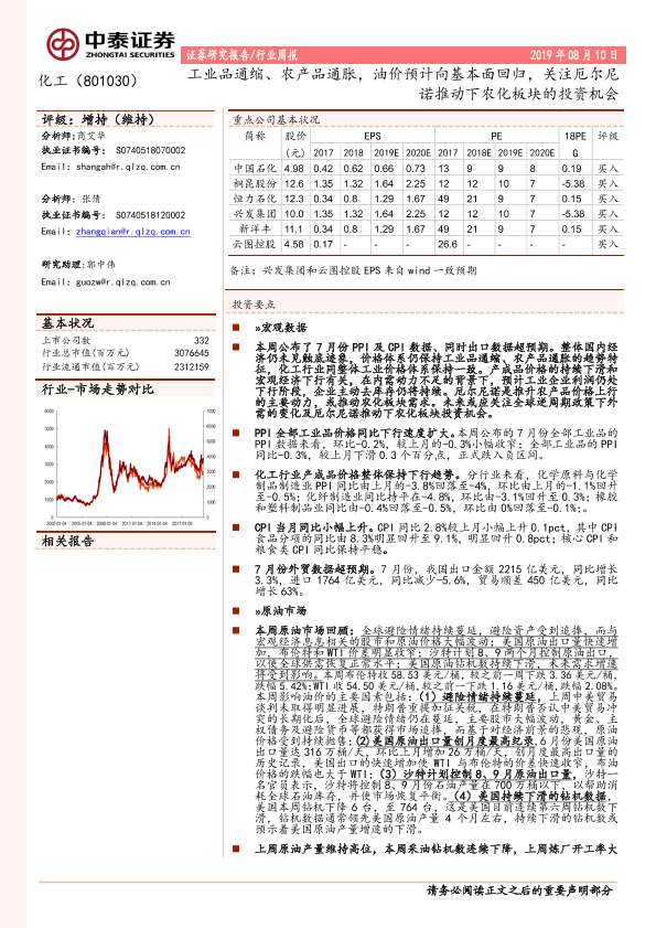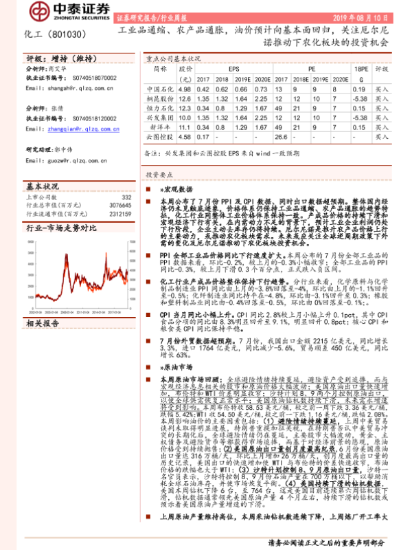 【中泰证券】【20190810】20190810-中泰证券-化工行业周报:工业品通缩、农产品通胀,油价预计向基本面回归,关注厄尔尼诺推动下农化板块的投资机会-23页