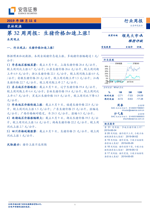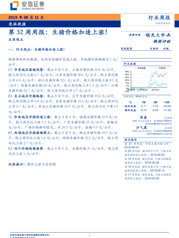 【安信证券】【20190811】农林牧渔行业第32周周报:生猪价格加速上涨!-20页