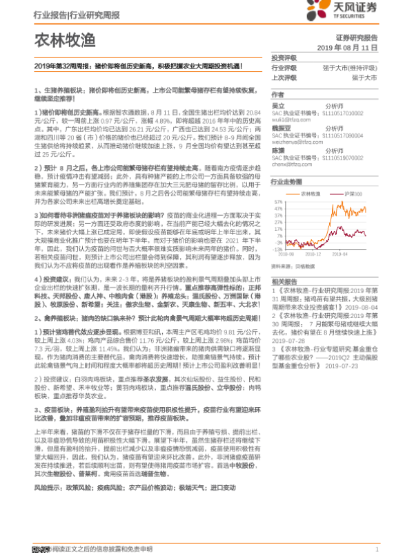 【天风证券】【20190811】农林牧渔行业2019年第32周周报:猪价即将创历史新高,积极把握农业大周期投资机遇!-15页