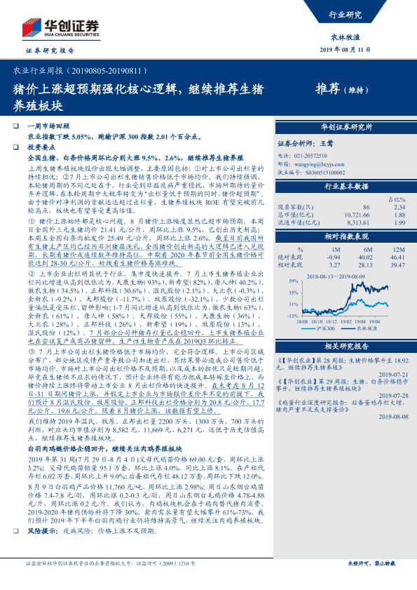 【华创证券】【20190811】20190811-华创证券-农业行业周报:猪价上涨超预期强化核心逻辑,继续推荐生猪养殖板块-27页