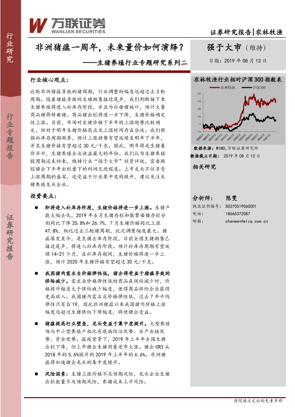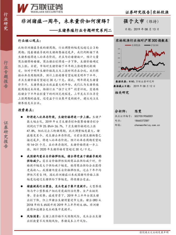 【万联证券】【20190813】20190813-万联证券-生猪养殖行业专题研究系列二:非洲猪瘟一周年,未来量价如何演绎?-18页