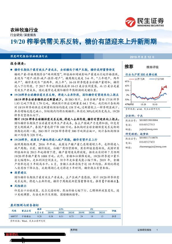 【民生证券】【20190812】19 20榨季供需关系反转,糖价有望迎来上升新周期-29页