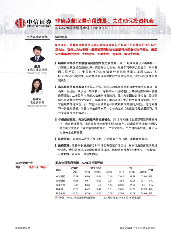 【中信证券】【20190819】农林牧渔行业跟踪点评:非瘟疫苗取得阶段进展,关注动保投资机会-2页