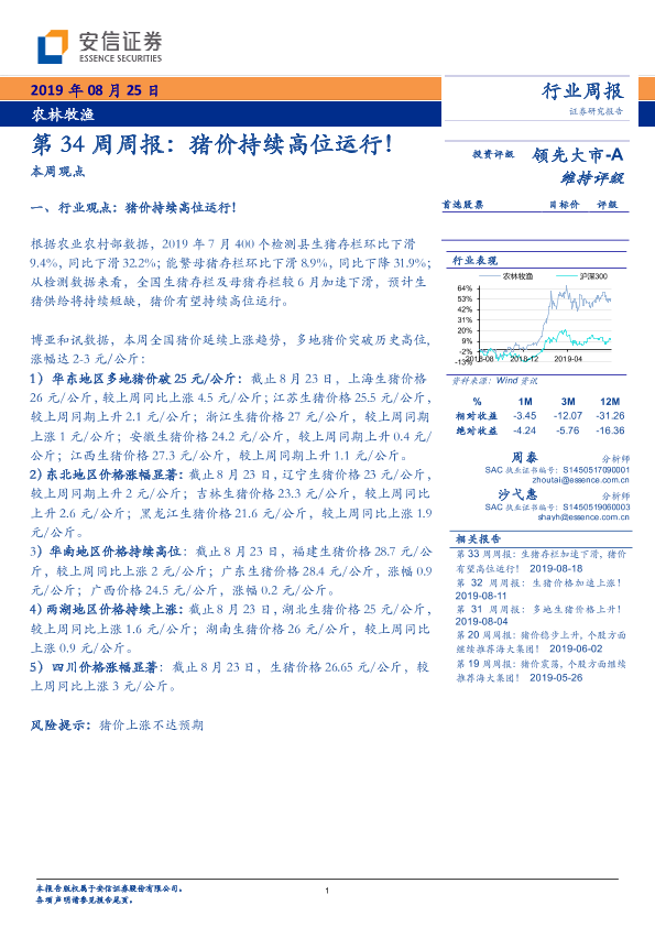 【安信证券】【20190825】20190825-安信证券-农林牧渔第34周周报:猪价持续高位运行!-18页