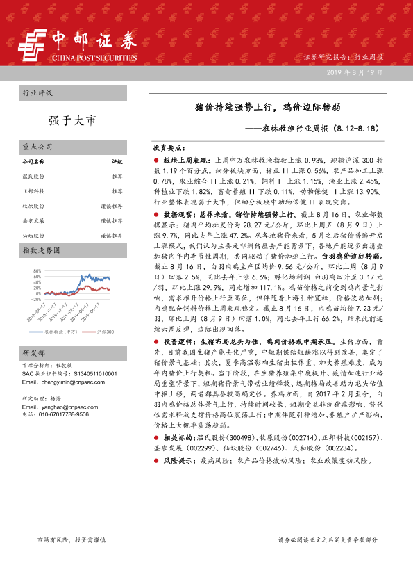 【中邮证券】【20190819】20190819-中邮证券-农林牧渔行业周报:猪价持续强势上行,鸡价边际转弱-13页