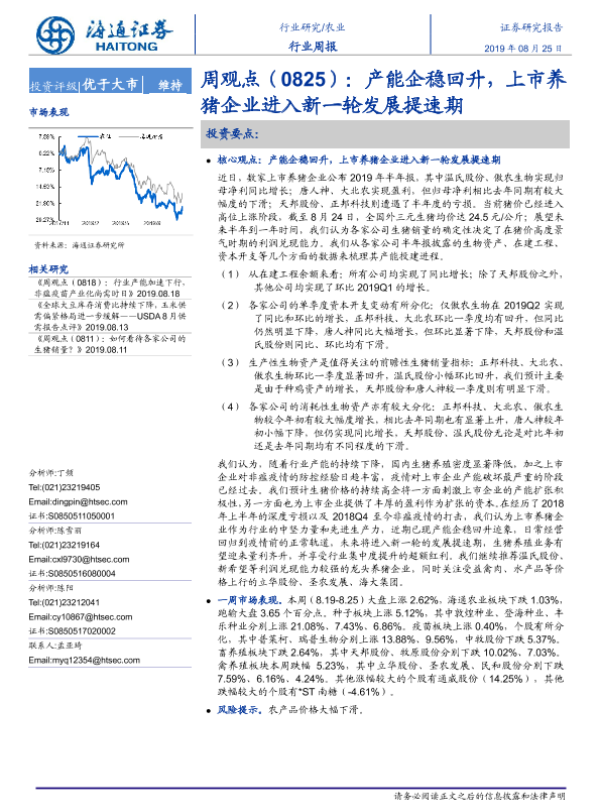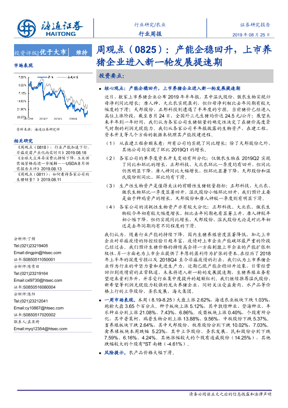 【海通证券】【20190825】20190825-海通证券-农业行业周观点:产能企稳回升,上市养猪企业进入新一轮发展提速期-5页