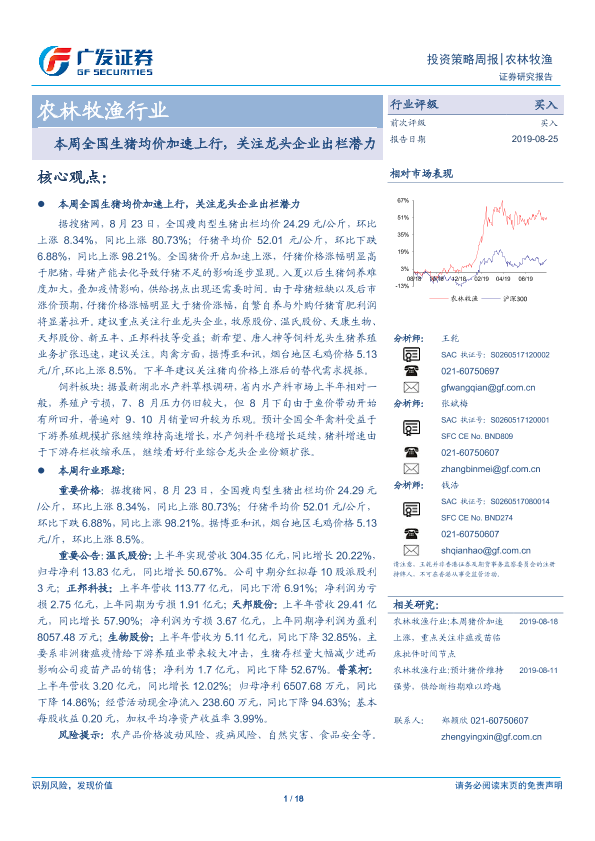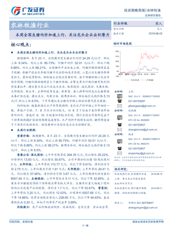 【广发证券】【20190825】20190825-广发证券-农林牧渔行业投资策略周报:本周全国生猪均价加速上行,关注龙头企业出栏潜力-18页
