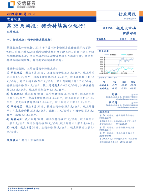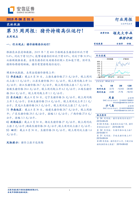 【安信证券】【20190831】20190831-安信证券-农林牧渔第35周周报:猪价持续高位运行!-18页