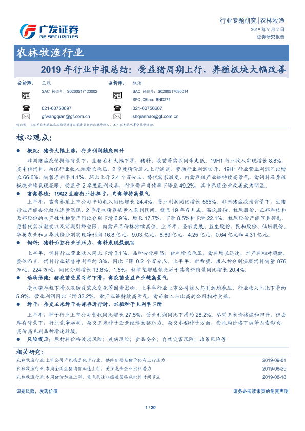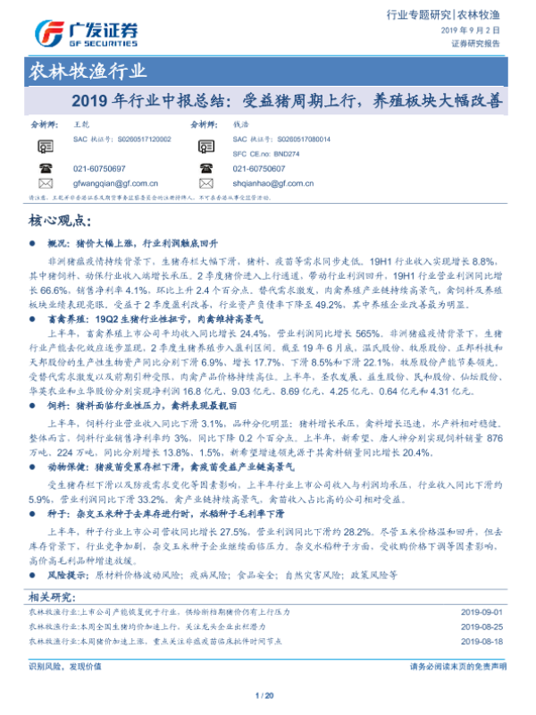【广发证券】【20190902】农林牧渔行业2019年行业中报总结:受益猪周期上行,养殖板块大幅改善-20页