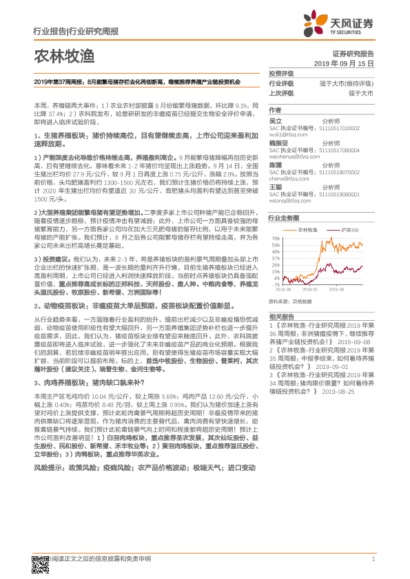【天风证券】【20190915】农林牧渔2019年第37周周报:8月能繁母猪存栏去化再创新高,继续推荐养殖产业链投资机会-14页