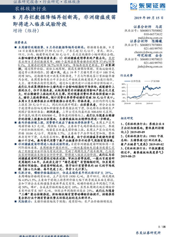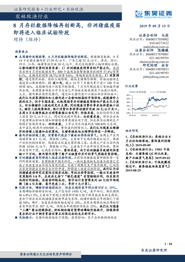 【东吴证券】【20190915】农林牧渔行业:8月存栏数据降幅再创新高,非洲猪瘟疫苗即将进入临床试验阶段-18页