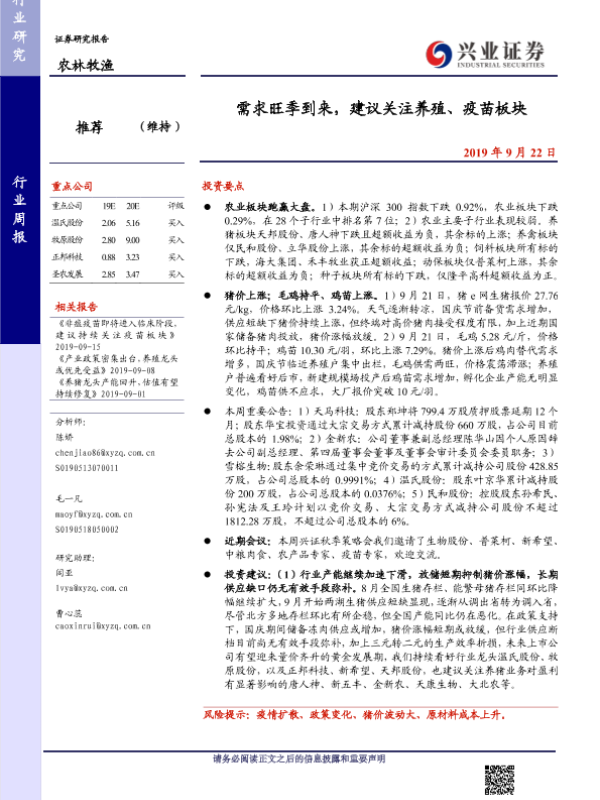 【兴业证券】【20190922】20190922-兴业证券-农林牧渔行业周报:需求旺季到来,建议关注养殖、疫苗板块-15页