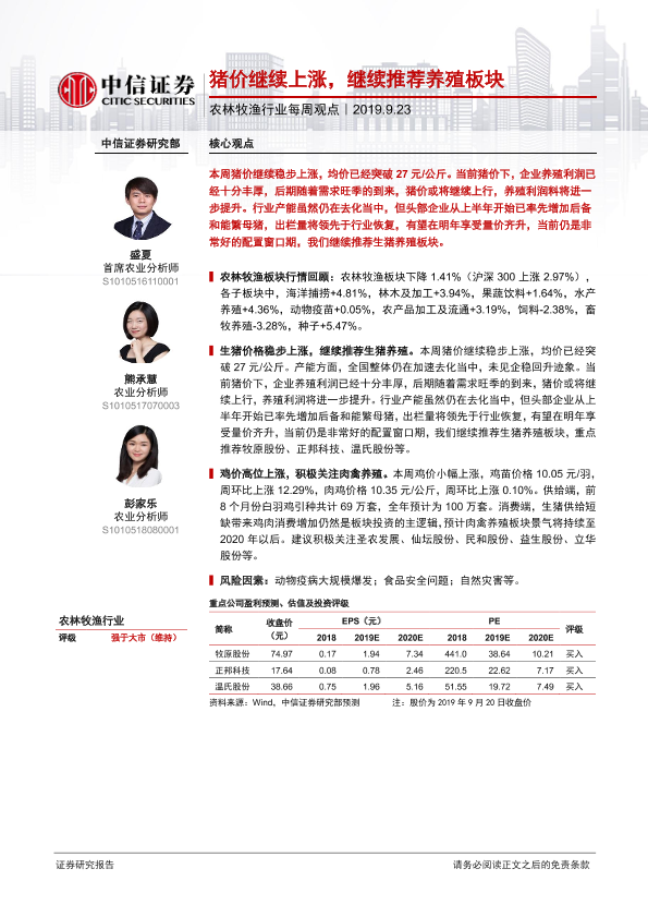 【中信证券】【20190923】20190923-中信证券-农林牧渔行业每周观点:猪价继续上涨,继续推荐养殖板块-6页