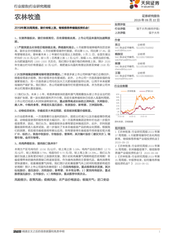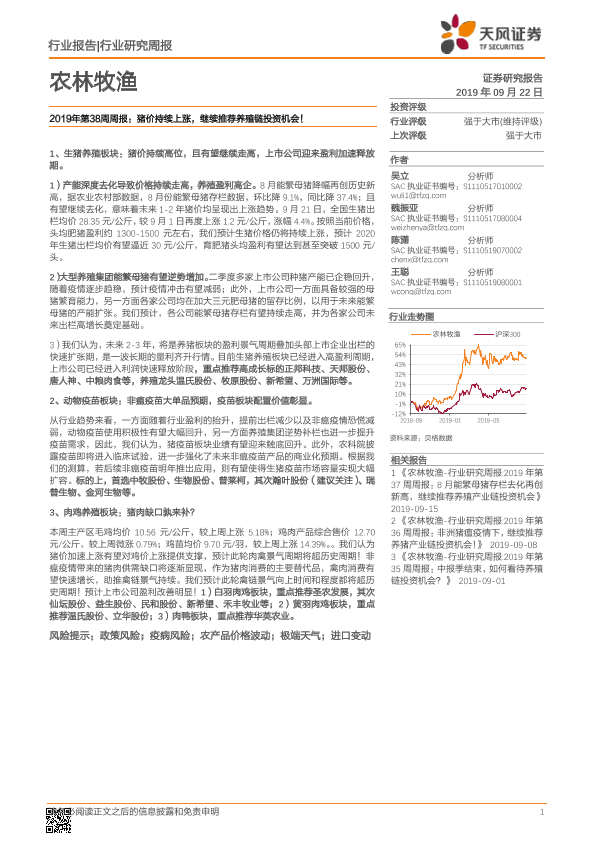 【天风证券】【20190922】农林牧渔2019年第38周周报:猪价持续上涨,继续推荐养殖链投资机会!-14页