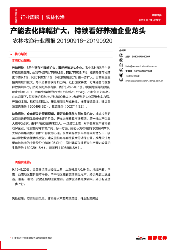 【西部证券】【20190922】20190922-西部证券-农林牧渔行业周报:产能去化降幅扩大,持续看好养殖企业龙头-11页