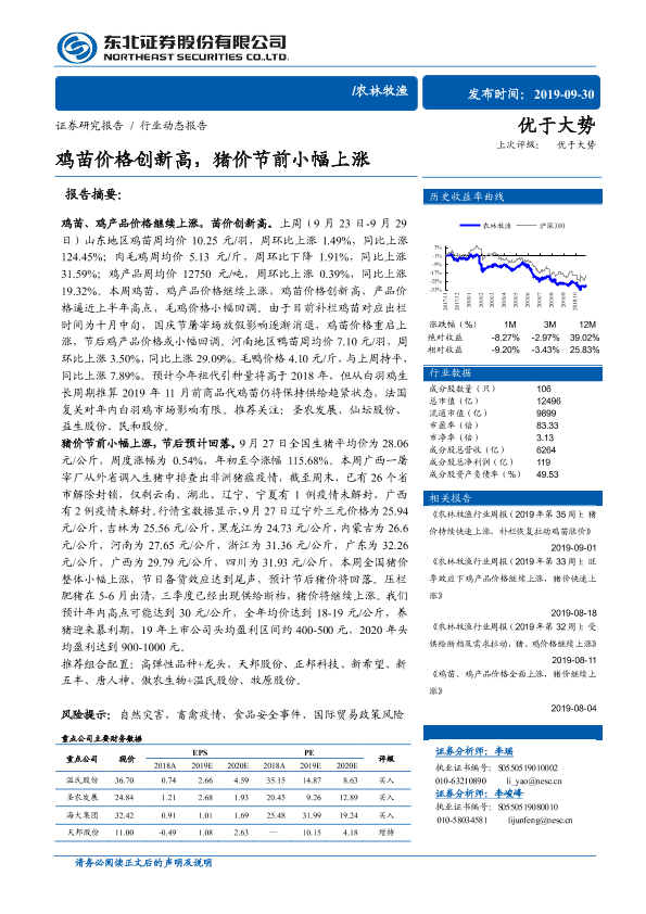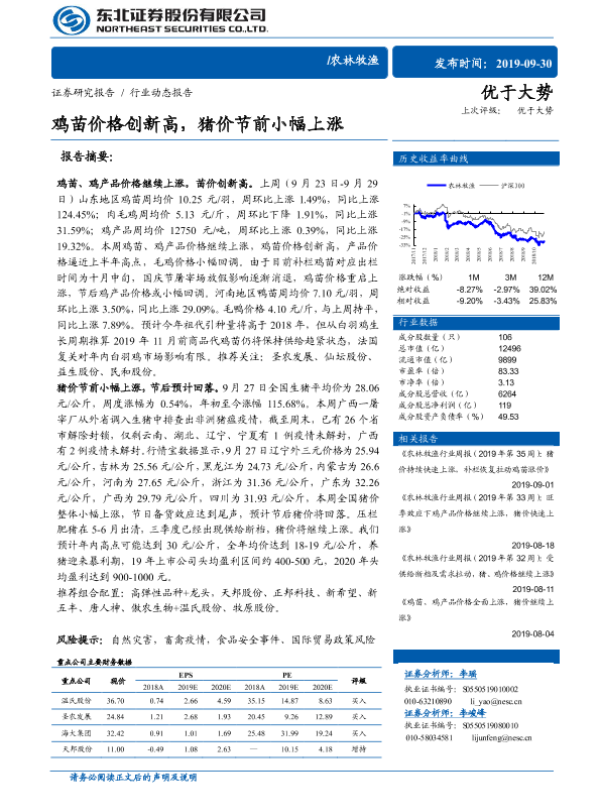 【东北证券】【20190930】农林牧渔:鸡苗价格创新高,猪价节前小幅上涨-11页