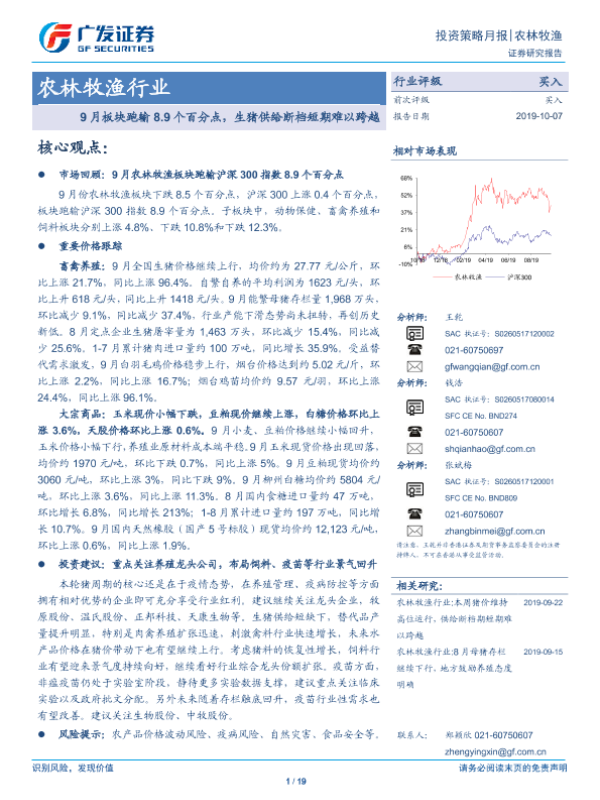【广发证券】【20191007】20191007-广发证券-农林牧渔行业投资策略月报:9月板块跑输8.9个百分点,生猪供给断档短期难以跨越-19页