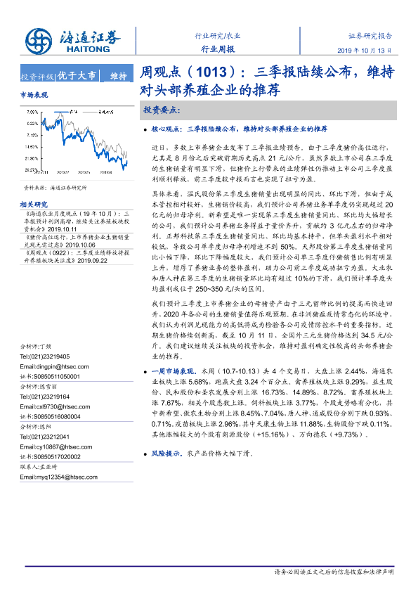 【海通证券】【20191013】20191013-海通证券-农业周观点:三季报陆续公布,维持对头部养殖企业的推荐-4页