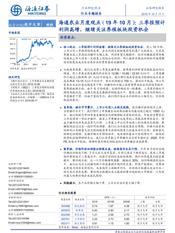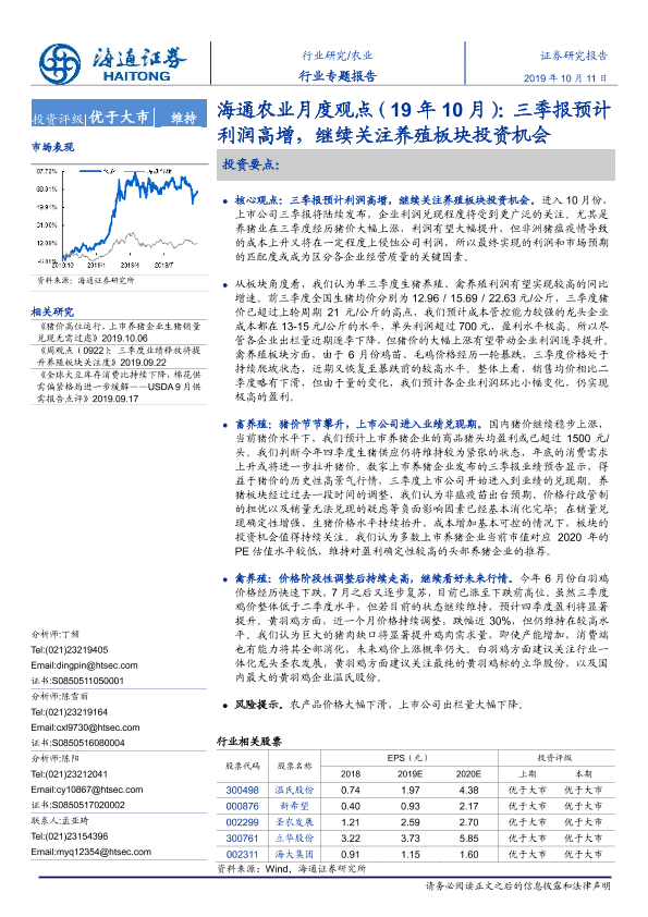 【海通证券】【201910】海通农业月度观点(19年10月):三季报预计利润高增,继续关注养殖板块投资机会-18页