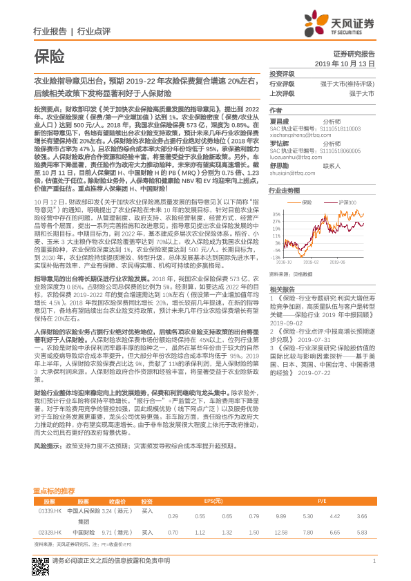 【天风证券】【20191013】农业险指导意见出台,预期2019-22年农险保费复合增速20%左右,后续相关政策下发将显著利好于人保财险-2页