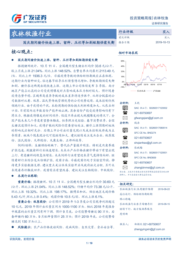 【广发证券】【20191013】20191013-广发证券-农林牧渔行业投资策略周报:国庆期间猪价快速上涨,留种、压栏等加剧短期供需失衡-19页