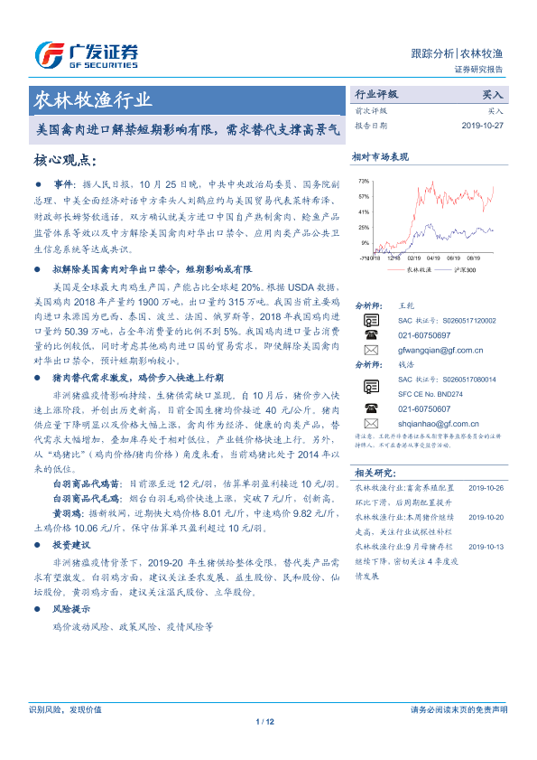 【广发证券】【20191027】农林牧渔行业:美国禽肉进口解禁短期影响有限,需求替代支撑高景气-12页