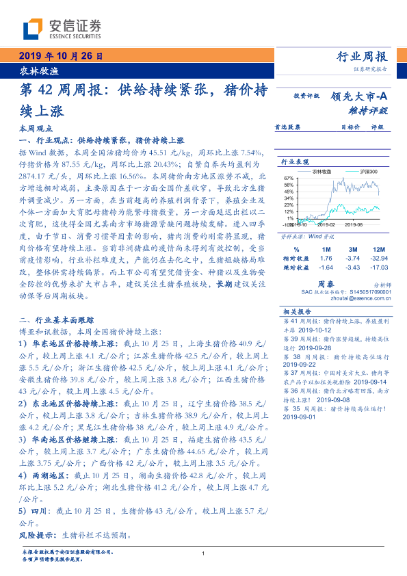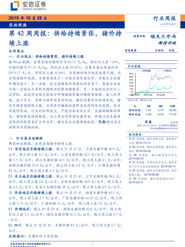 【安信证券】【20191026】农林牧渔第42周周报:供给持续紧张,猪价持续上涨-18页