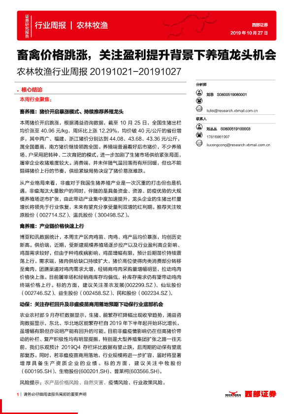 【西部证券】【20191027】20191027-西部证券-农林牧渔行业周报:畜禽价格跳涨,关注盈利提升背景下养殖龙头机会-12页