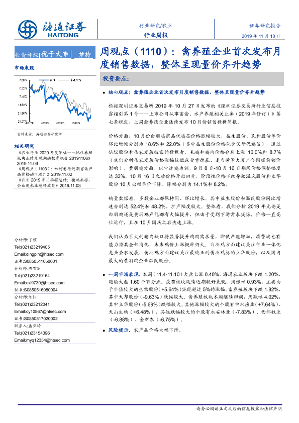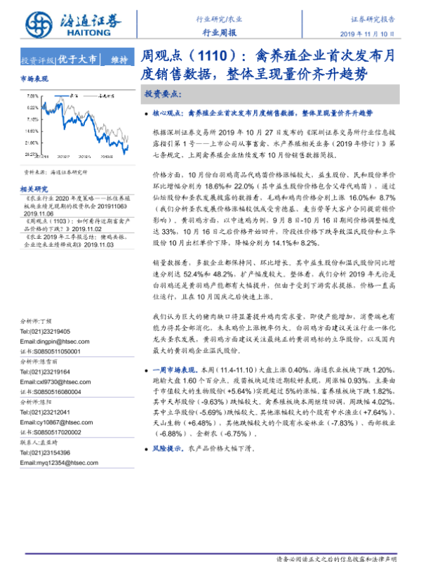 【海通证券】【20191110】20191110-海通证券-农业周观点:禽养殖企业首次发布月度销售数据,整体呈现量价齐升趋势-4页