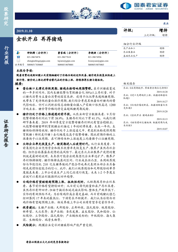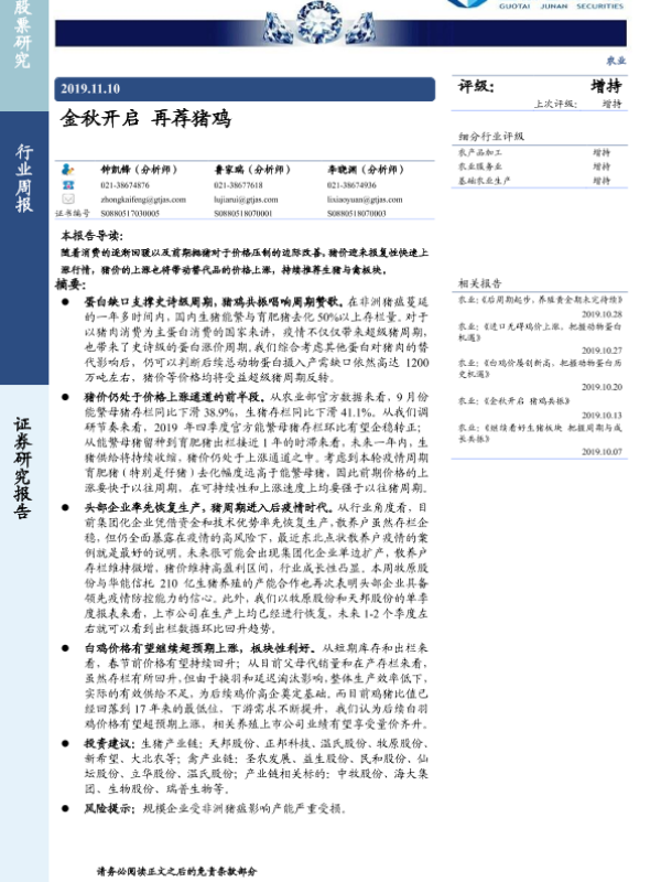 【国泰君安证券】【20191110】20191110-国泰君安-农业行业周报:金秋开启 再荐猪鸡-13页
