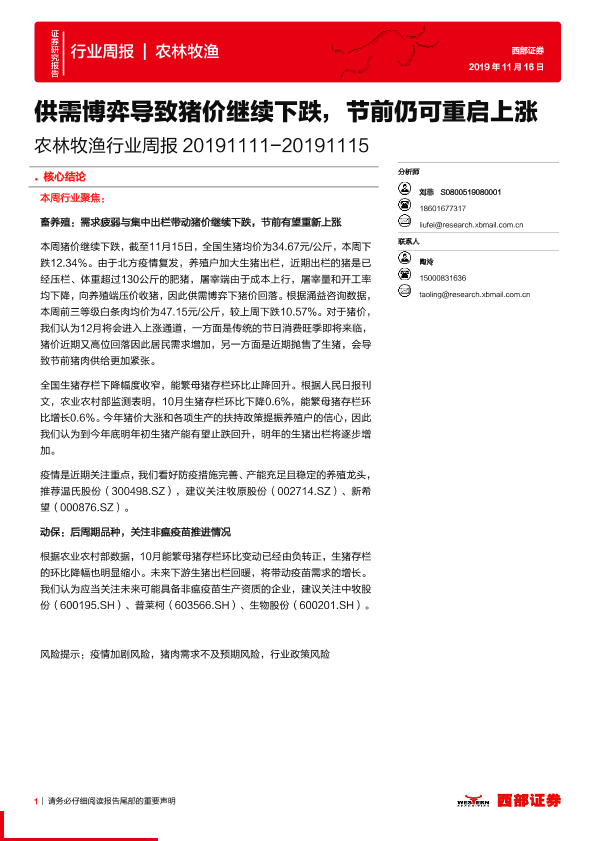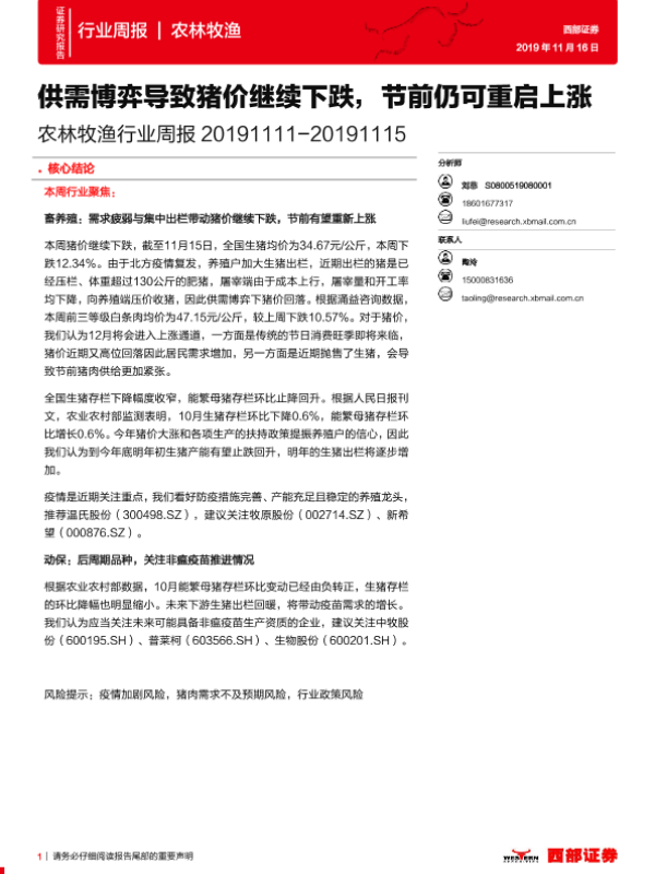 【西部证券】【20191116】20191116-西部证券-农林牧渔行业周报:供需博弈导致猪价继续下跌,节前仍可重启上涨-13页