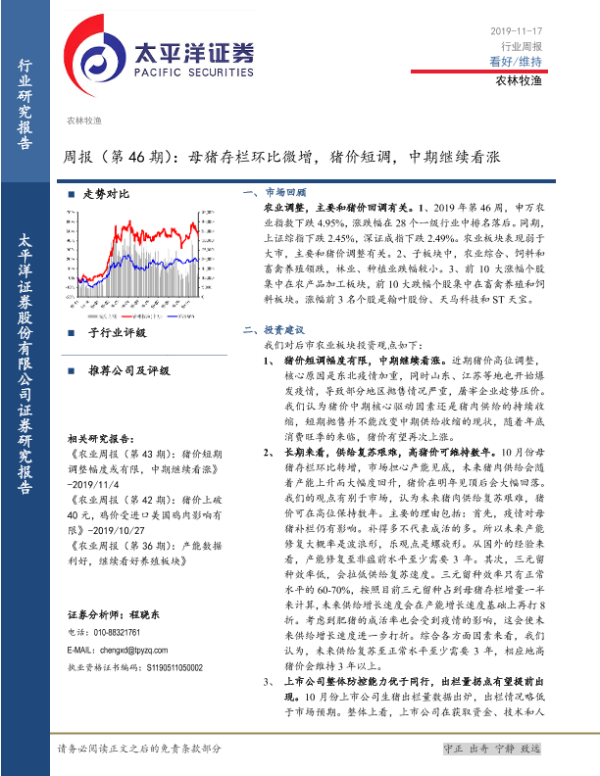 【太平洋证券】【20191117】农林牧渔周报(第46期):母猪存栏环比微增,猪价短调,中期继续看涨-17页